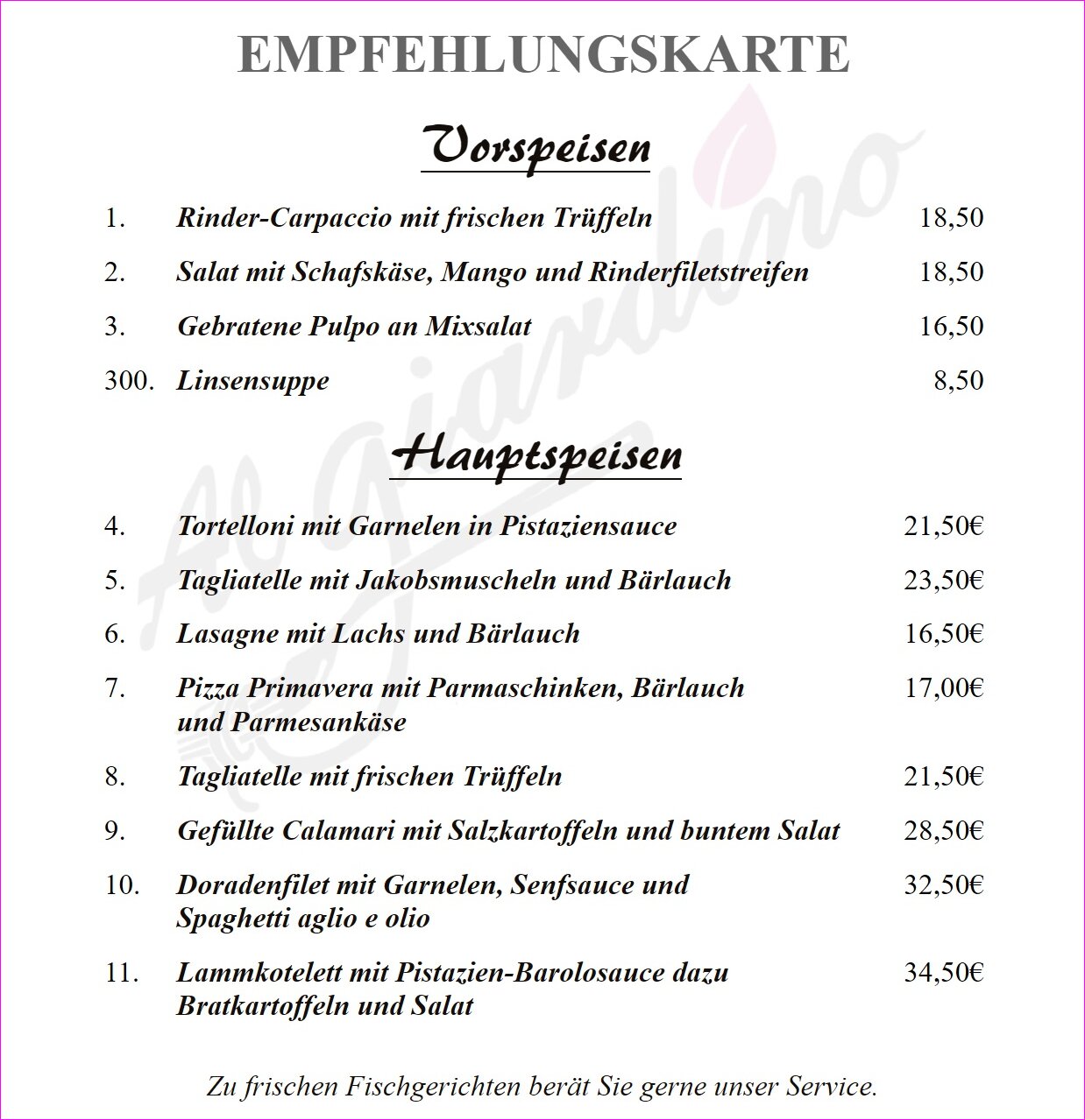 Herzlich Willkommen! Das Restaurant Al Giardino befindet sich in der malerischen Altstadt von Büdingen und bietet eine freundliche Atmosphäre sowie köstliche Speisen und Getränke.