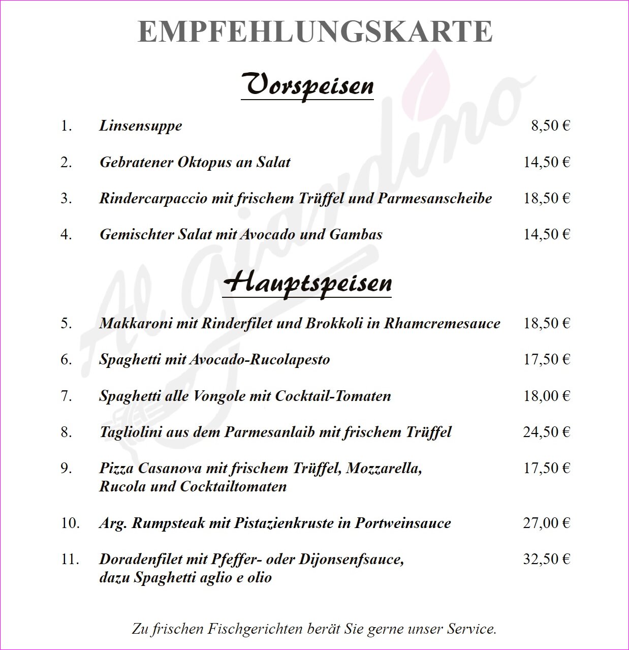 Herzlich Willkommen! Das Restaurant Al Giardino befindet sich in der malerischen Altstadt von Büdingen und bietet eine freundliche Atmosphäre sowie köstliche Speisen und Getränke.